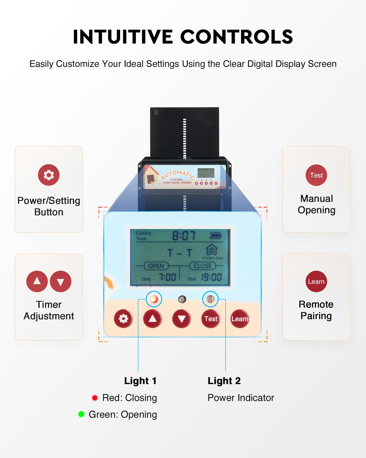 - Automatic and Adjustable: Features a light sensor that automatically opens the door at dawn and closes it at dusk, coupled with a weatherproof timer for full control over opening and closing times, adapting to your unique farming needs.