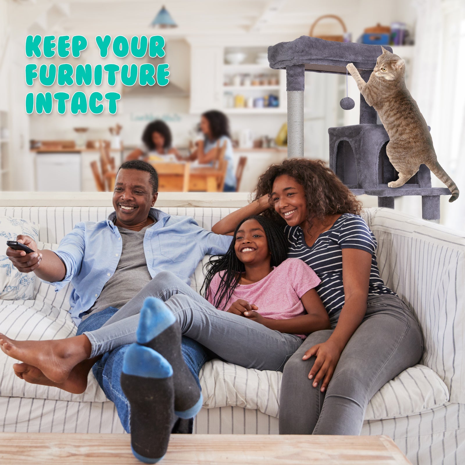 To satisfy your cat's natural instincts and keep your furniture intact, our cat tree comes with durable sisal-wrapped posts to heal your cat's scratching urge and fluffy pom-poms to acquire their thrill of hunting.
