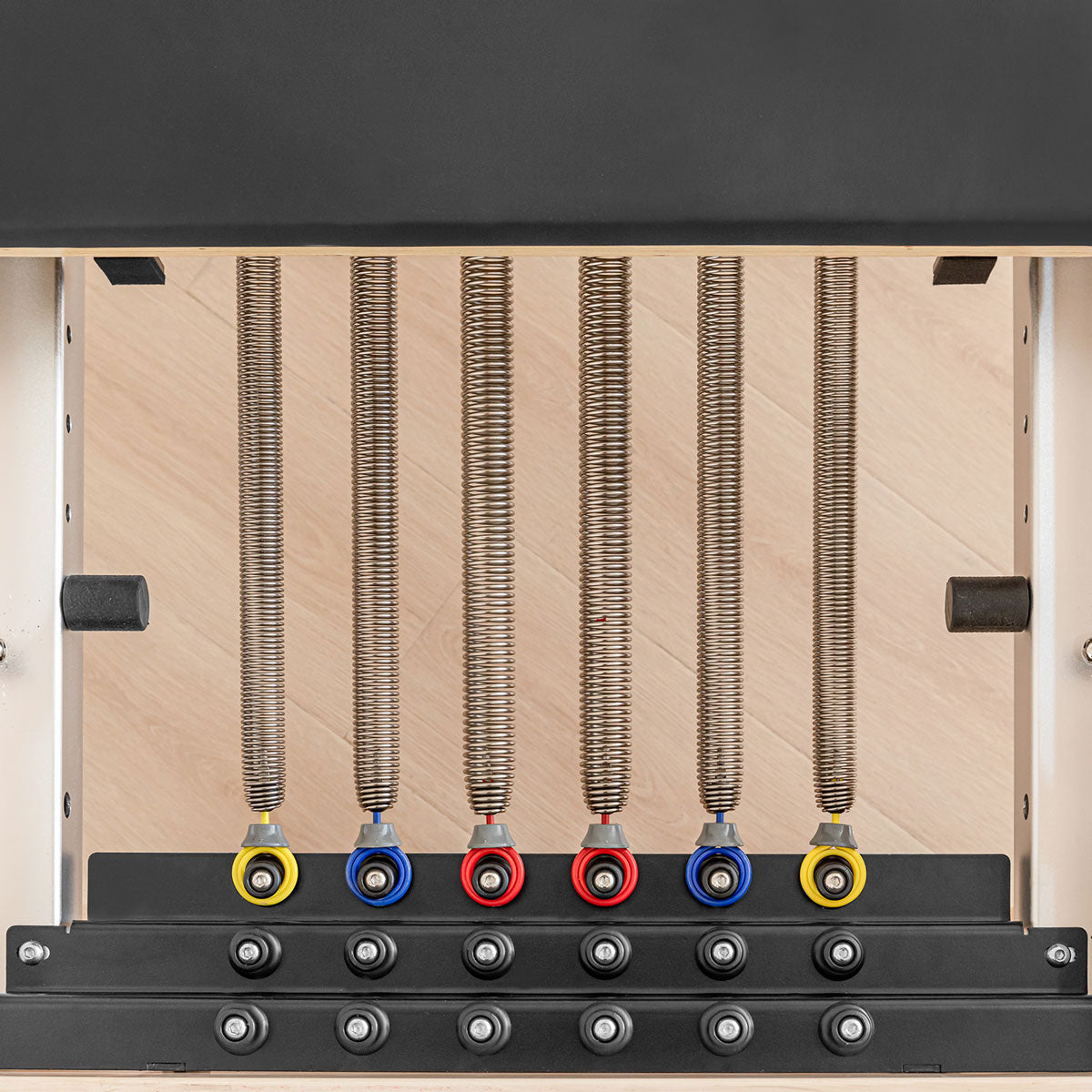 - Springs (Reformer Bed): 6 Tempered High-Carbon Studio Grade Springs, 2x Red (Hard, 28kg), 2x Blue (Medium, 12kg), 2x Yellow (Easy, 9kg)