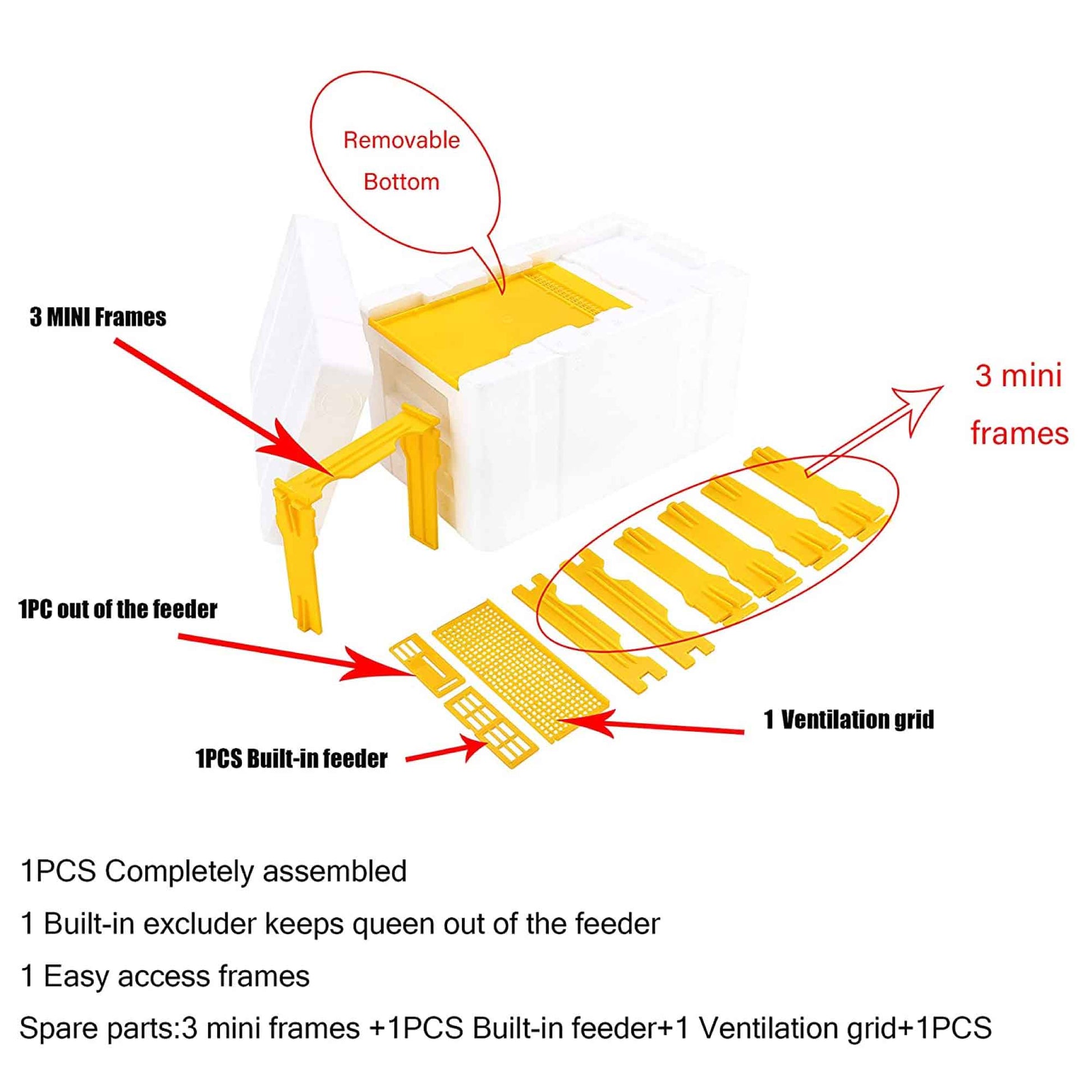 It features excellent heat insulation to ensure that beekeepers continue to breed high quality queen bees in early spring, summer heat and late autumn. The thermal insulation performance of plastic and foam is three times that of wooden materials. It protects the miniature bee colony from heat and cold.