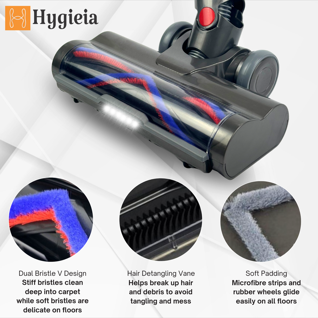 With the Hygieia powerhead for the LG A9 cordless vacuum, you can pick up human hair and pet hair, deep clean your carpet, or vacuum hard surfaces quickly and effortlessly.