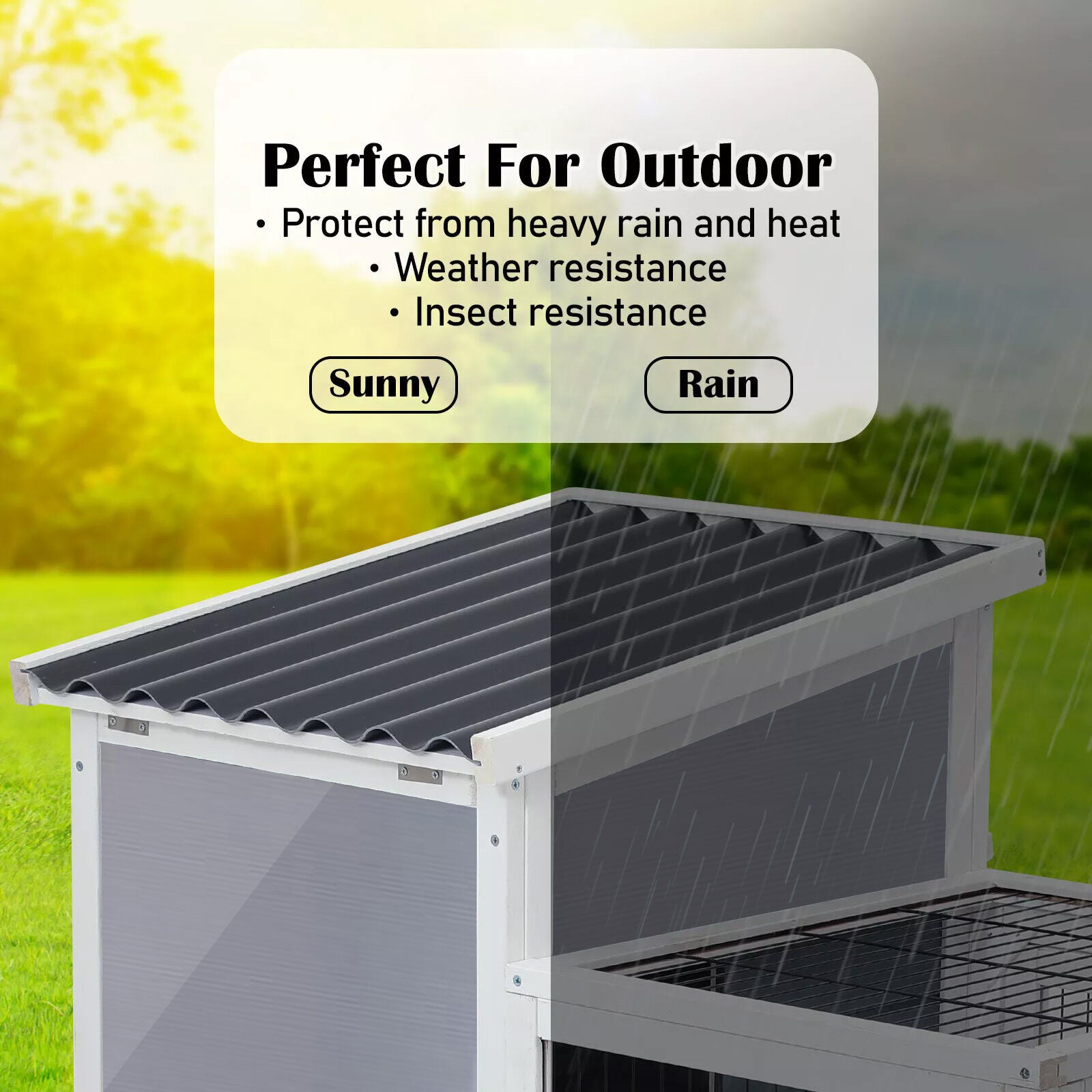 It is crucial to keep pets cool to prevent heat stress, especially if they live outdoors. Our hutch is designed to keep pets cool, and it features a well-insulated and weatherproof PVC roof that can withstand extreme weather conditions. Additionally, the hutch provides convenience and security with a pull-out tray for quick cleaning and several lockable doors for safeguarding and easy access.