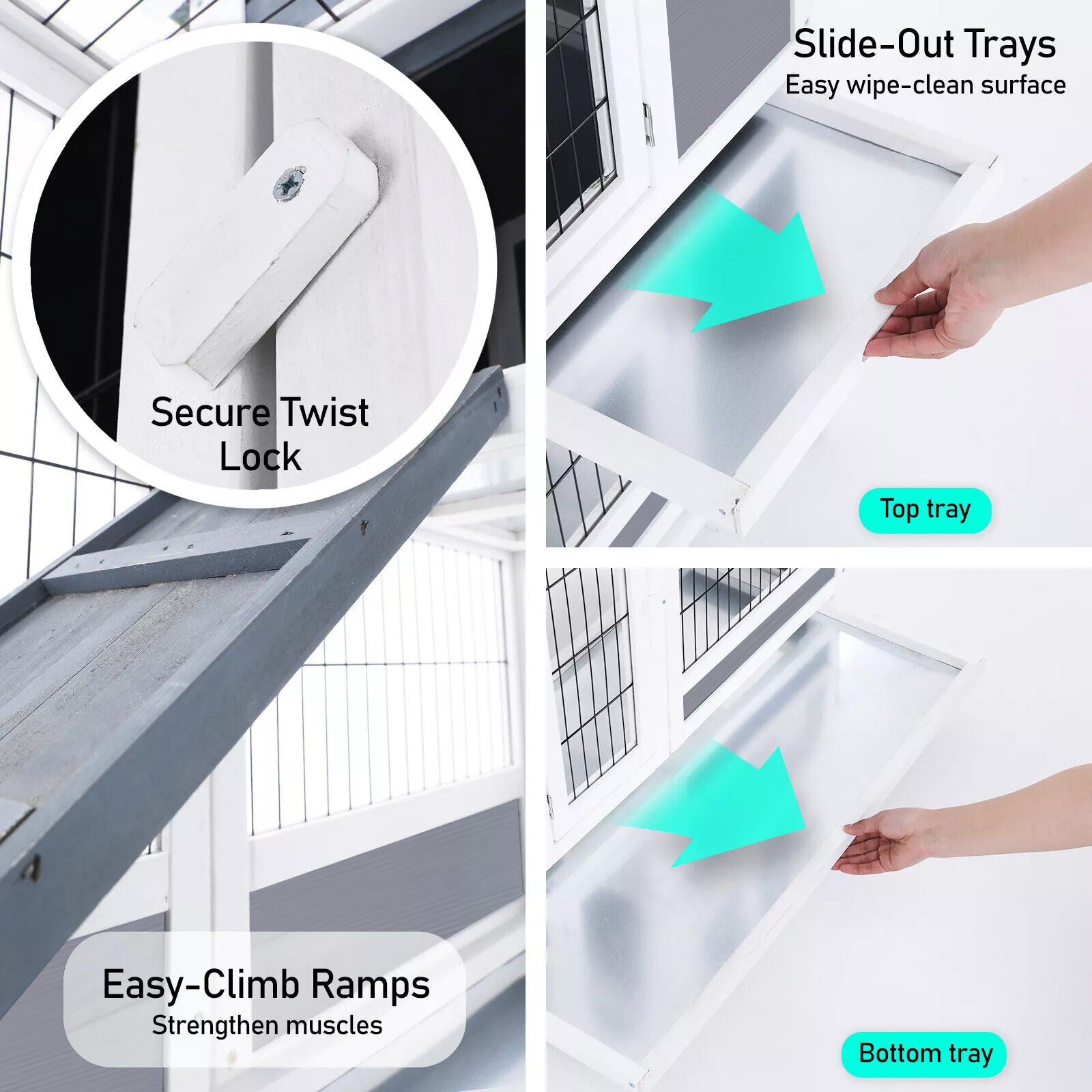Made from polycarbonate and galvanised mesh wire, our hutch provides a safe and durable space for your pets to rest and exercise. With a double-level enclosure and a ramp to strengthen your pets' muscles, this hutch is designed to meet your pets' needs.