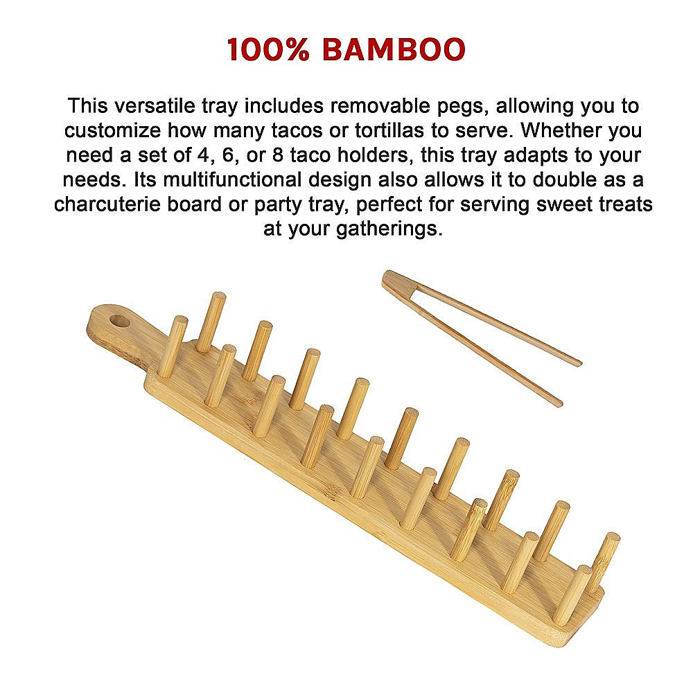 - Includes: Taco tray, 18 removable pegs, and bamboo tongs