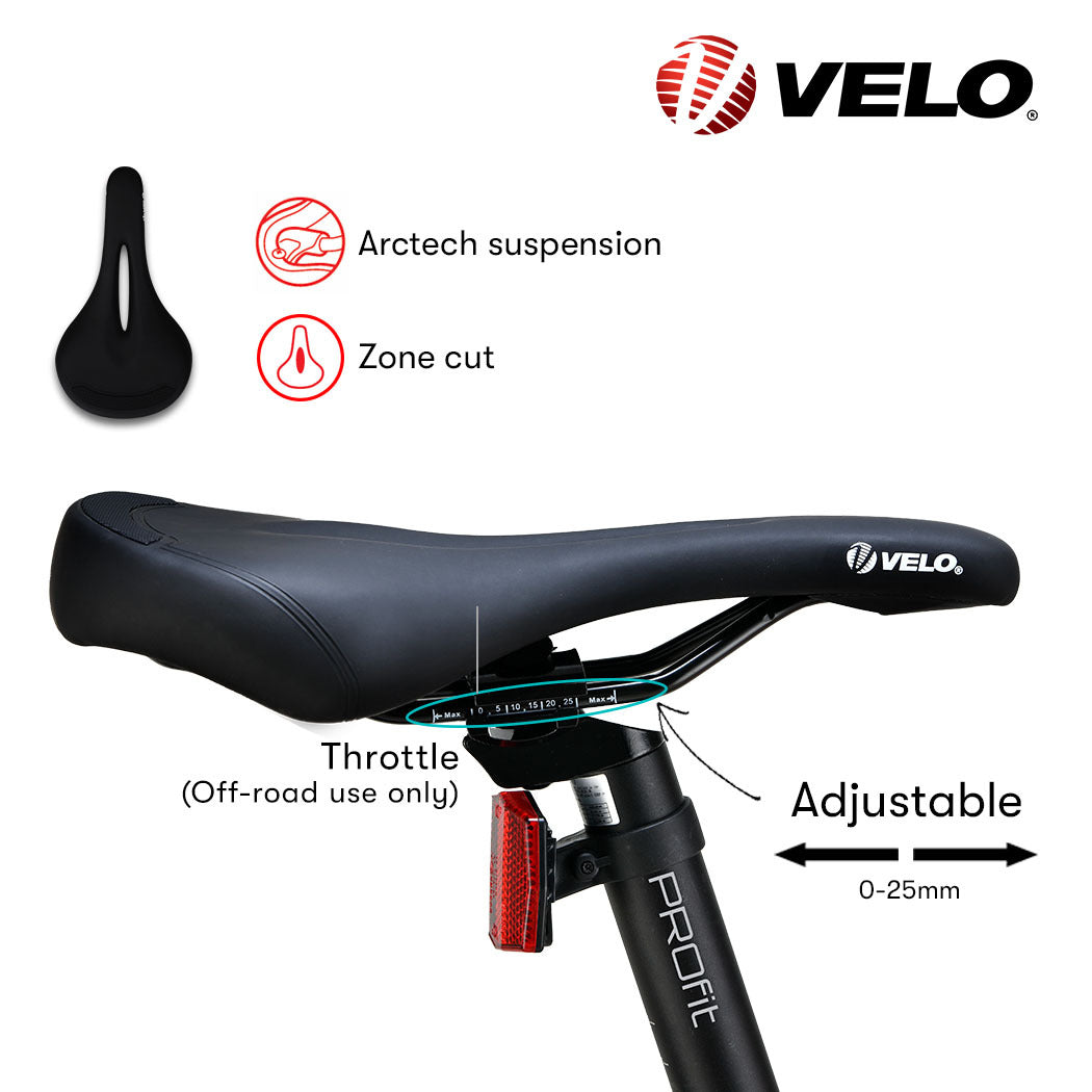 The MX7 series e-MTB comes equipped with Shimano 7-speed SIS-Index gears and derailleur, and a high performance VELO saddle. Front and rear disc brakes and low-profile dual rubber compound 27.5 Maxxis Pace tyres offer serious control.