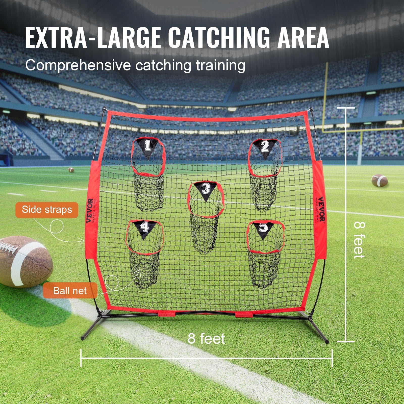 VEVOR 8 x 8 ft Football Trainer Throwing Net, Training Throwing Target Practice Net with 5 Target Pockets, Knotless Net Includes Bow Frame and Portable Carry Case, Improve QB Throwing Accuracy, Red