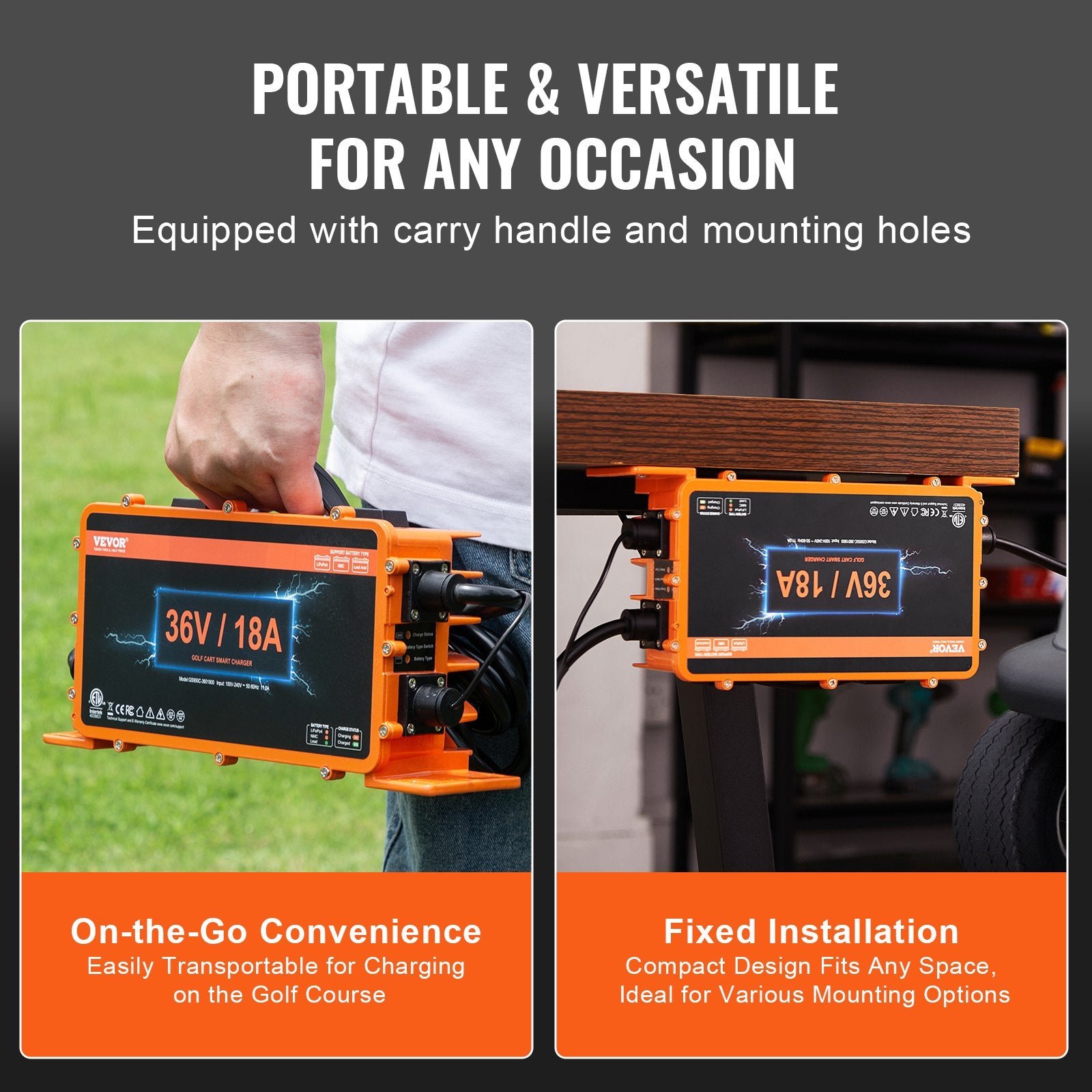 VEVOR Golf Cart Battery Charger, 18 AMP, Smart Club Car Charger with Crowfoot Plug, Compatible with Lead-Acid AGM/GEL/EFB MF NMC LiFePO4 Batteries for Club Car EZGO Yamaha, IP67 ETL Certified