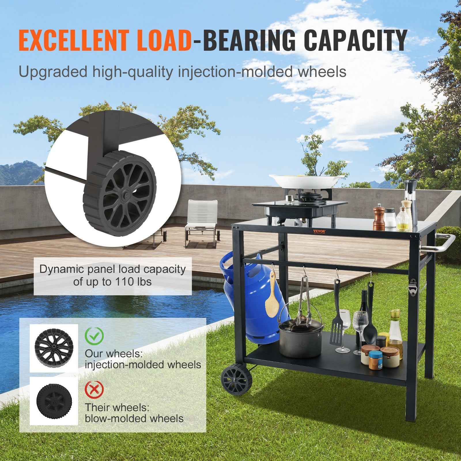 VEVOR Outdoor Grill Dining Cart with Double-Shelf, 85*55cm BBQ Movable Food Prep Table, Multifunctional Iron Table Top, Portable Modular Carts for Pizza Oven, Worktable with 2 Wheels, Carry Handle, Black