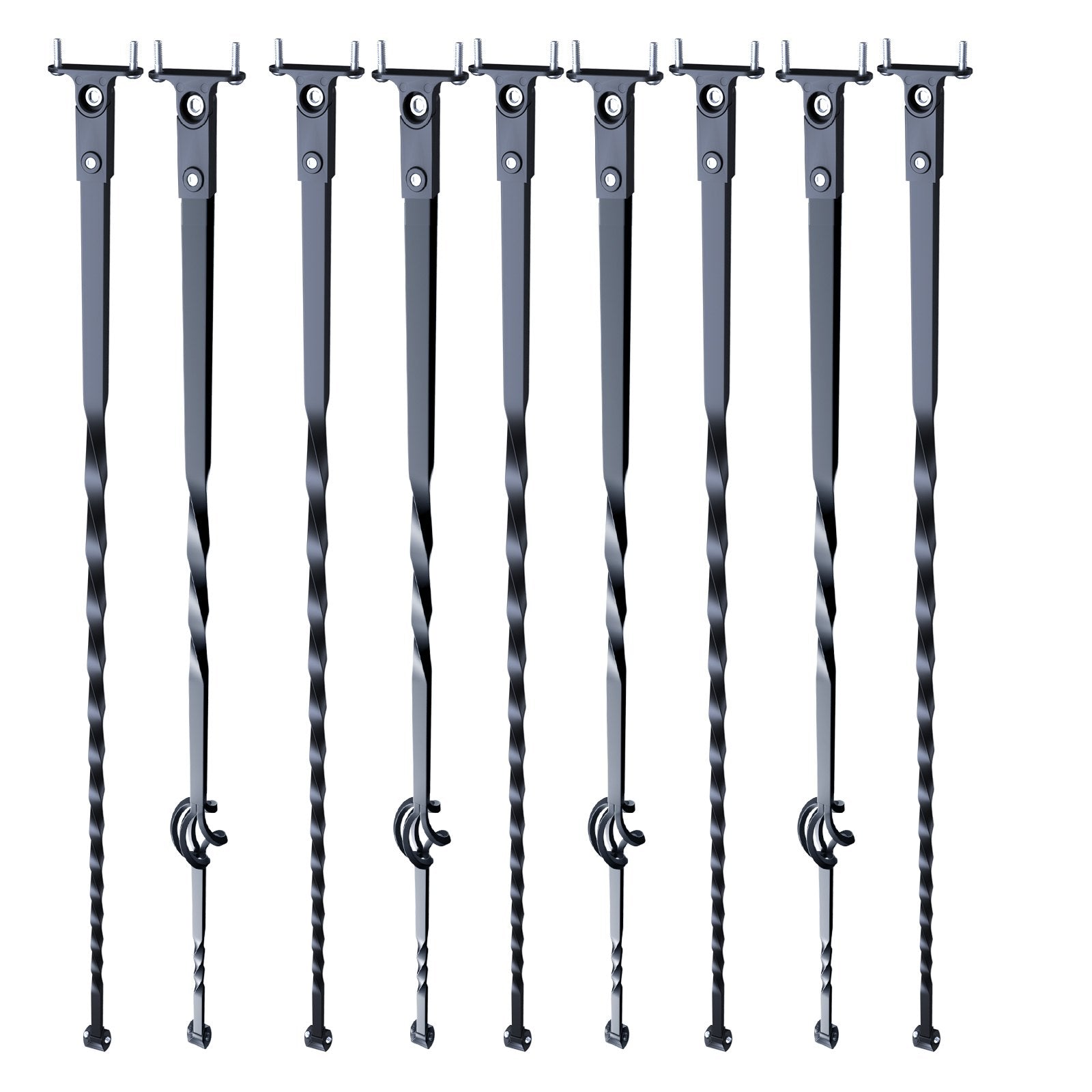 Each set includes 5 single-basket balusters, 5 spiral balusters, 10 flat baluster shoes, 10 angled baluster shoes, 40 screws, and 1 instruction manual. Each shaft has a length of 44'' and a width of 0.5'', compatible with most railing connectors or shoes on the market. The 44-inch length is suitable for most railing frameworks.