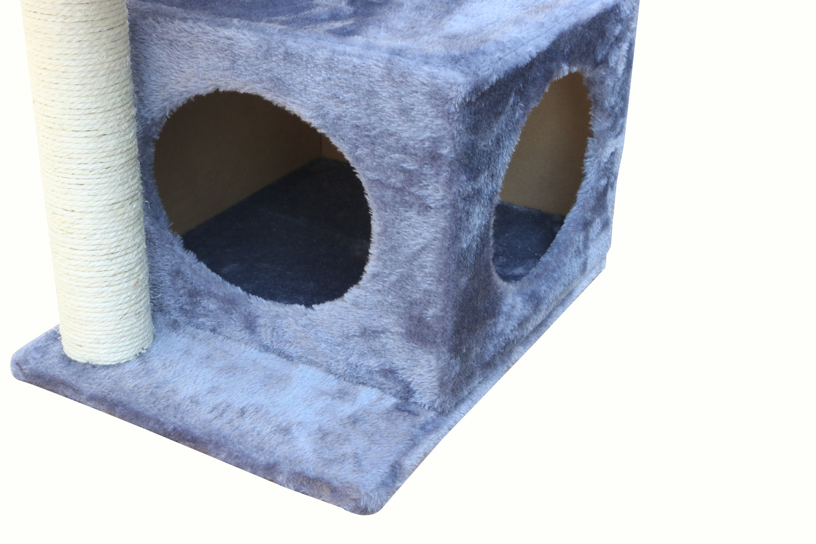 There is a resting box at the bottom of the tree to provide some shelter. The tubes are wrapped with sisal ropes for your pets to scratch and play with. The sturdy base prevents any swaying so it is safe on any flat surface so you do not have to worry about injury to your cat. The stylish cat tree will blend in with your decor.