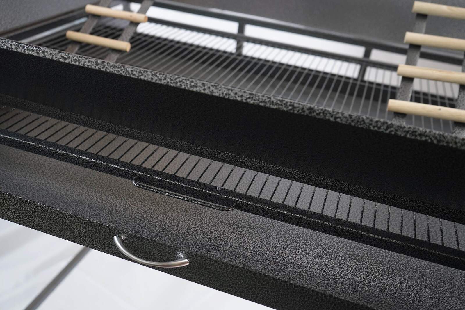 - Metal play ring in center, multiple wooden perches for resting plus 2 stainless steel bowls for food and water