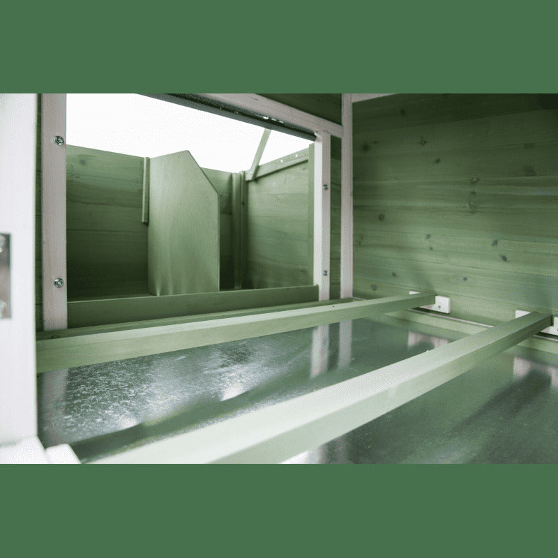 - Integrated nesting box and the roof of the nesting box can be opened for collecting eggs